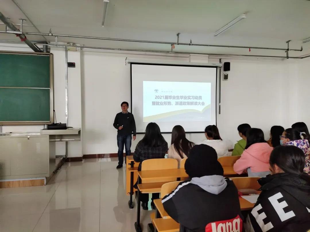 会上,王英利副经理结合往届毕业生就业去向调查情况及考研数据,明确指出了现阶段就业及考研形势的严峻性,对就业和考研提出了指导意见;介绍了各专业的自主实习的目的、内容和任务,强调了实习的意义和实习考核要求。张迪主任为大家讲解了就业派遣政策和网上签约流程;提醒同学们在就业和实习时要提高自我防范意识,维护自身安全,树立正确的择业观与就业观。